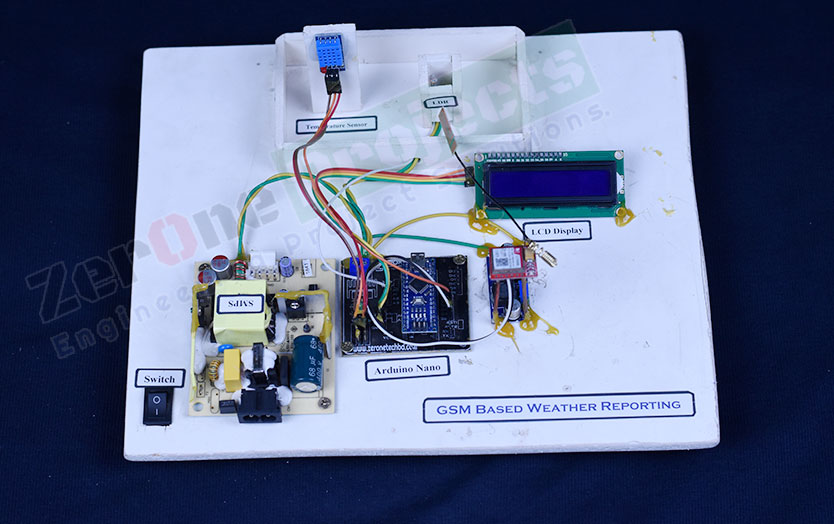 This is the communication based project that name is GSM Based Weather Reporting. Through In this project can be monitoring & reporting different weather parameters such as light intensiry,temperature etc.weather paramitters will be send a mobile through sms by GSM SIM 800L module.In this project we mainly used a Arduino Nano,DHT-11Temperature sensor, LDR, LCD Display, SMPS and others nessecessary equipments.